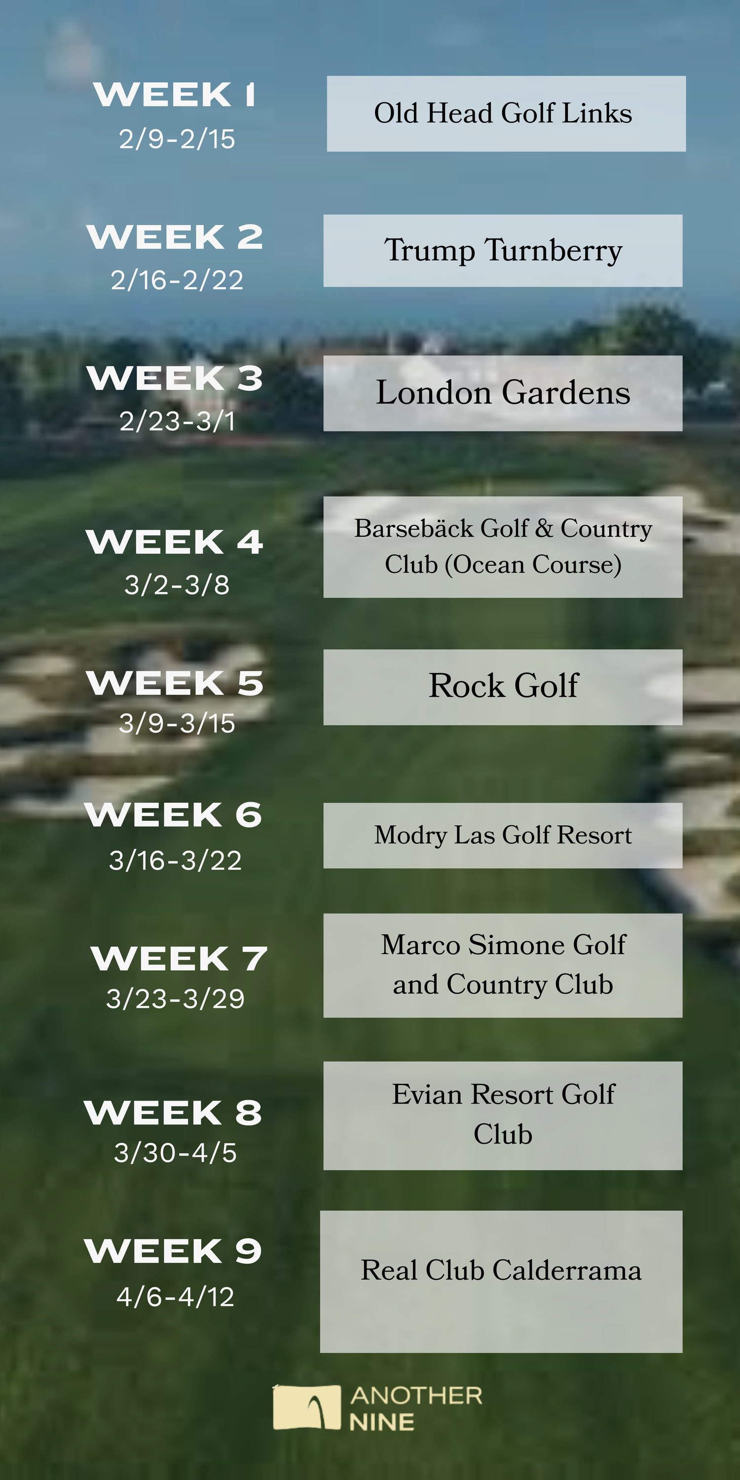 Each week you will play on a different course.