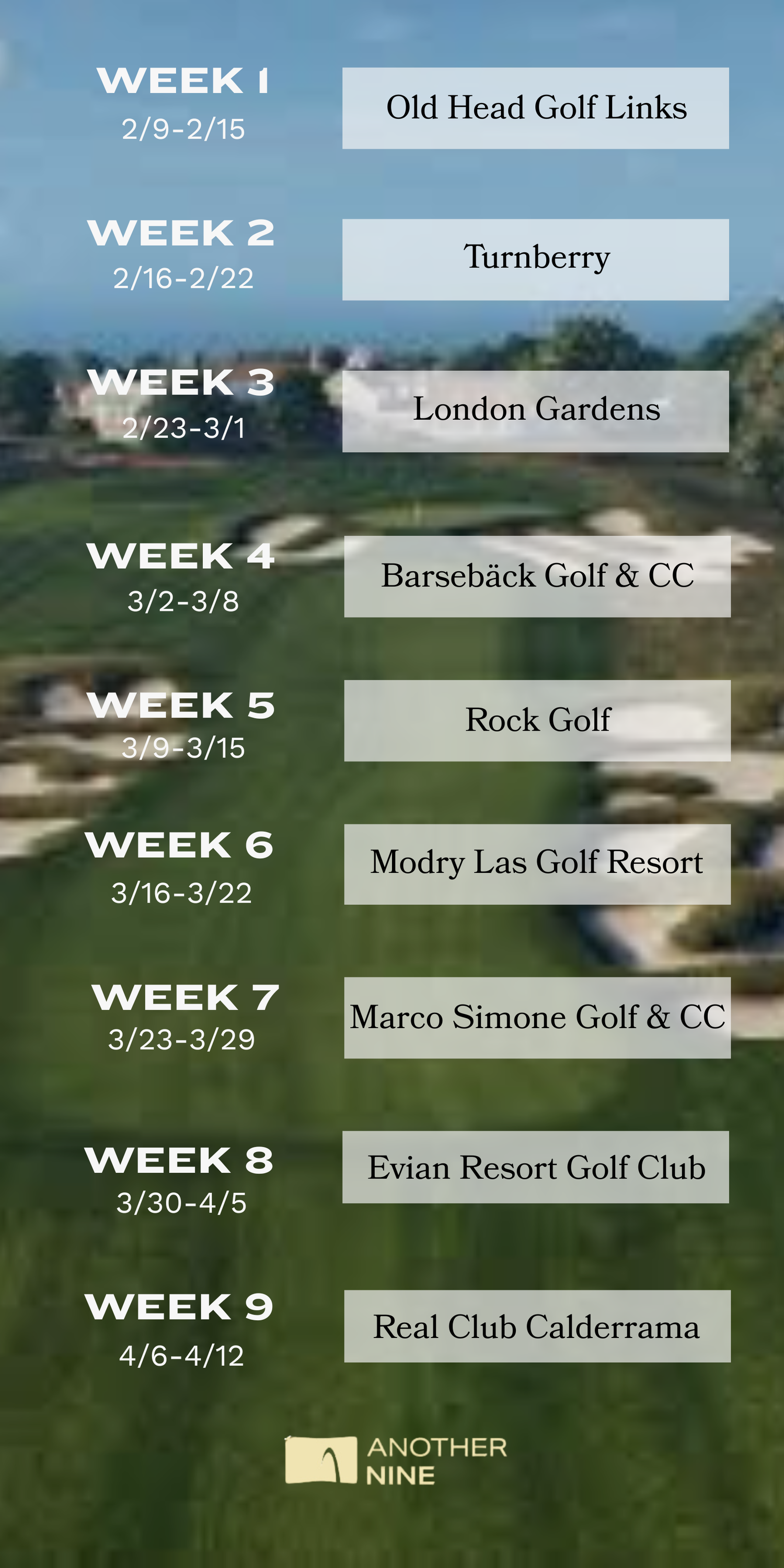 - Nine rounds, nine weeks, nine courses